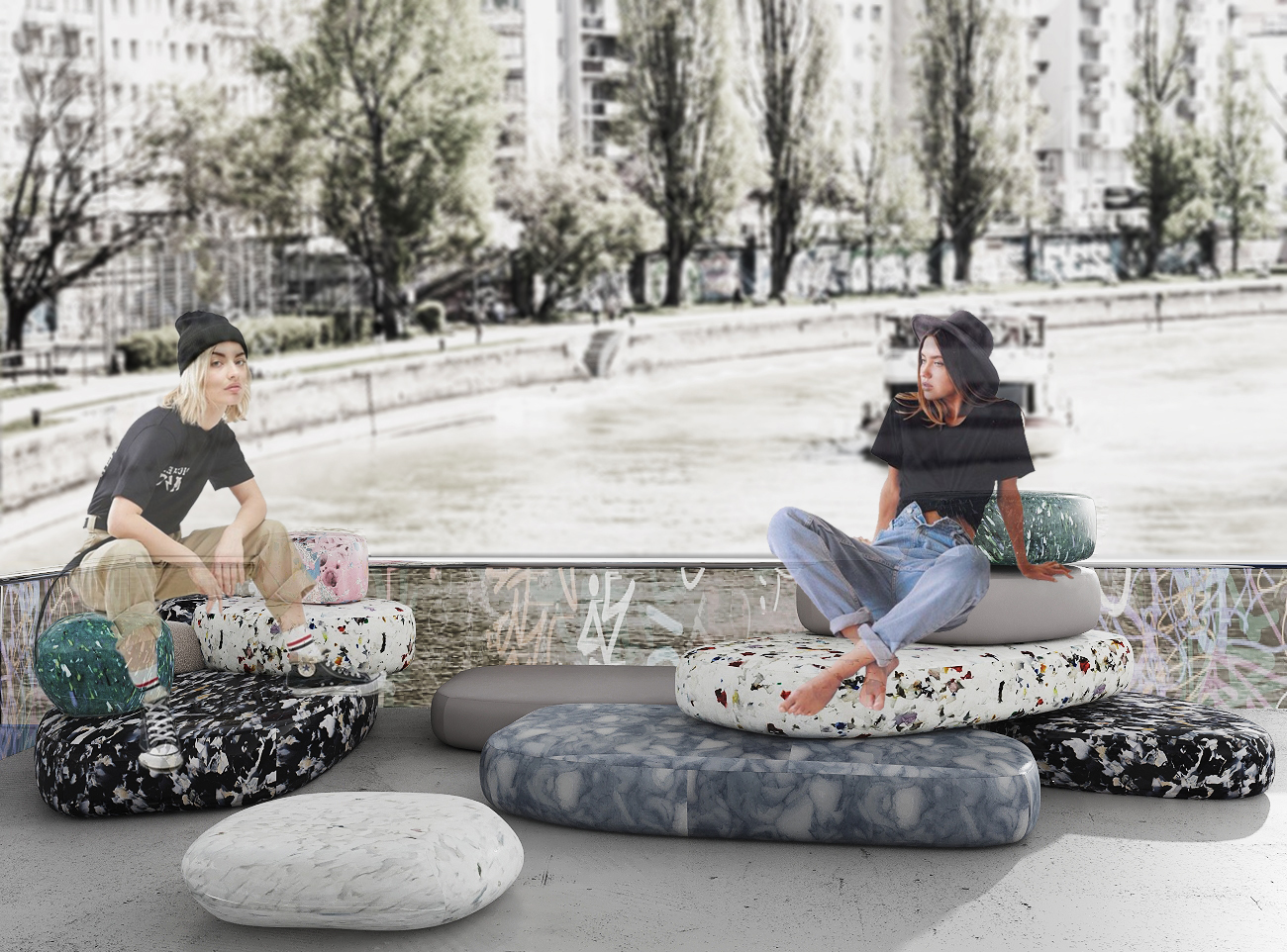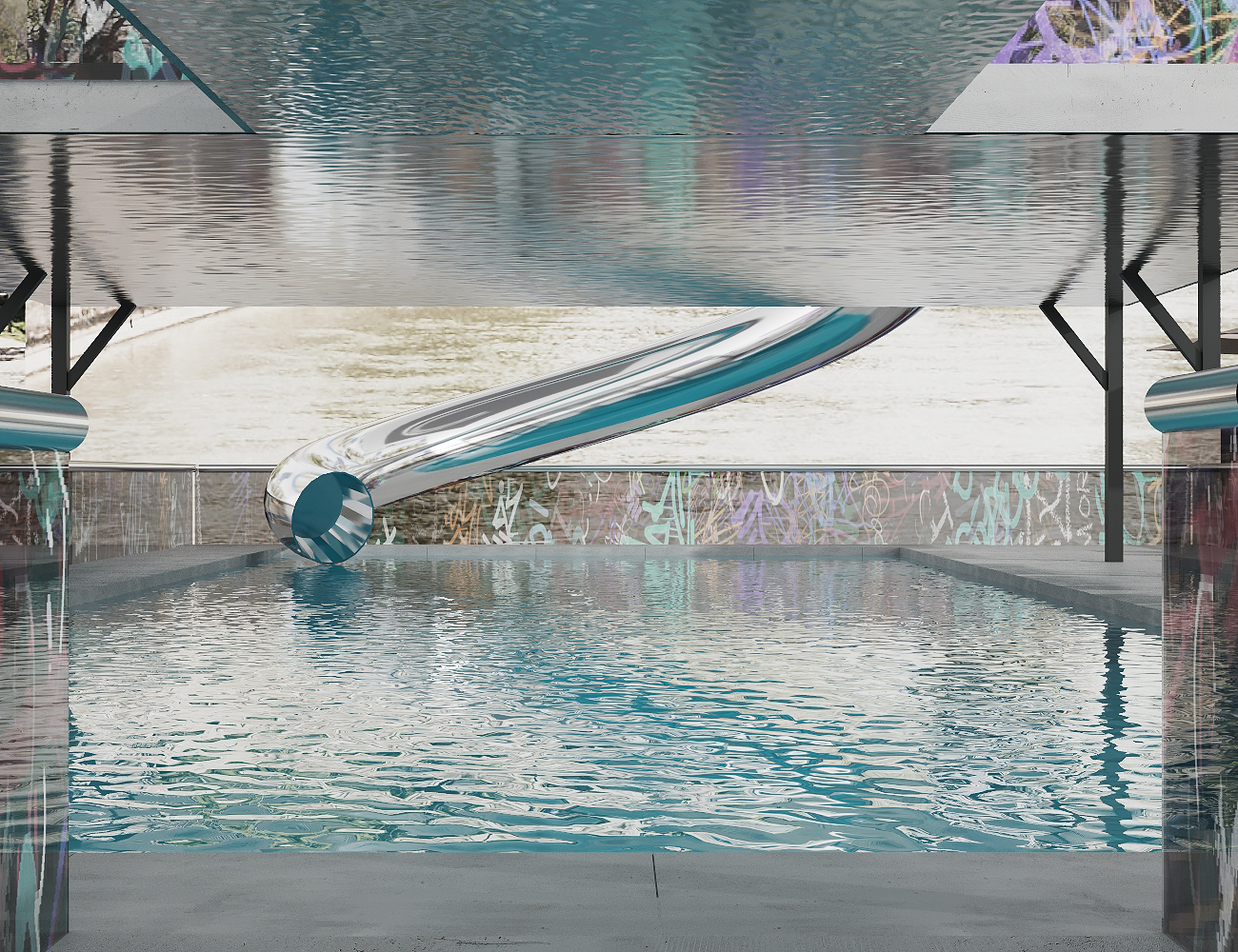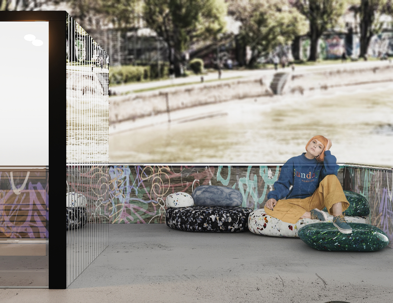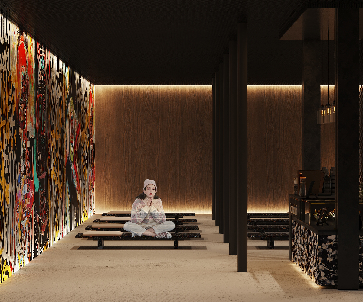 This University project focused on the redesign of the «Bathing Ship» at the urbanized Donau Canal Vienna, reimagining wellness with its unique underground atmosphere. Inspired by a vibrant graffiti culture of the area, street art served as a primary influence in the design concept. Additionally, furniture crafted from recycled plastic caps and bottles added a touch of sustainability and creativity. The top floor featured seats resembling river pebbles, offering visitors a customizable sitting experience. Another standout feature was a mirrored sauna seamlessly blending with its surroundings, along with a mirrored water slide for added amusement, enhancing the overall guest experience.