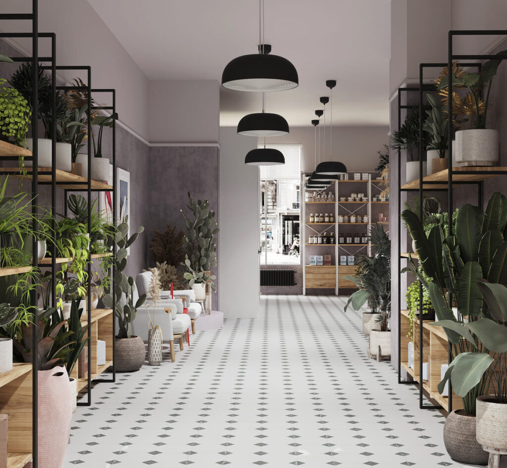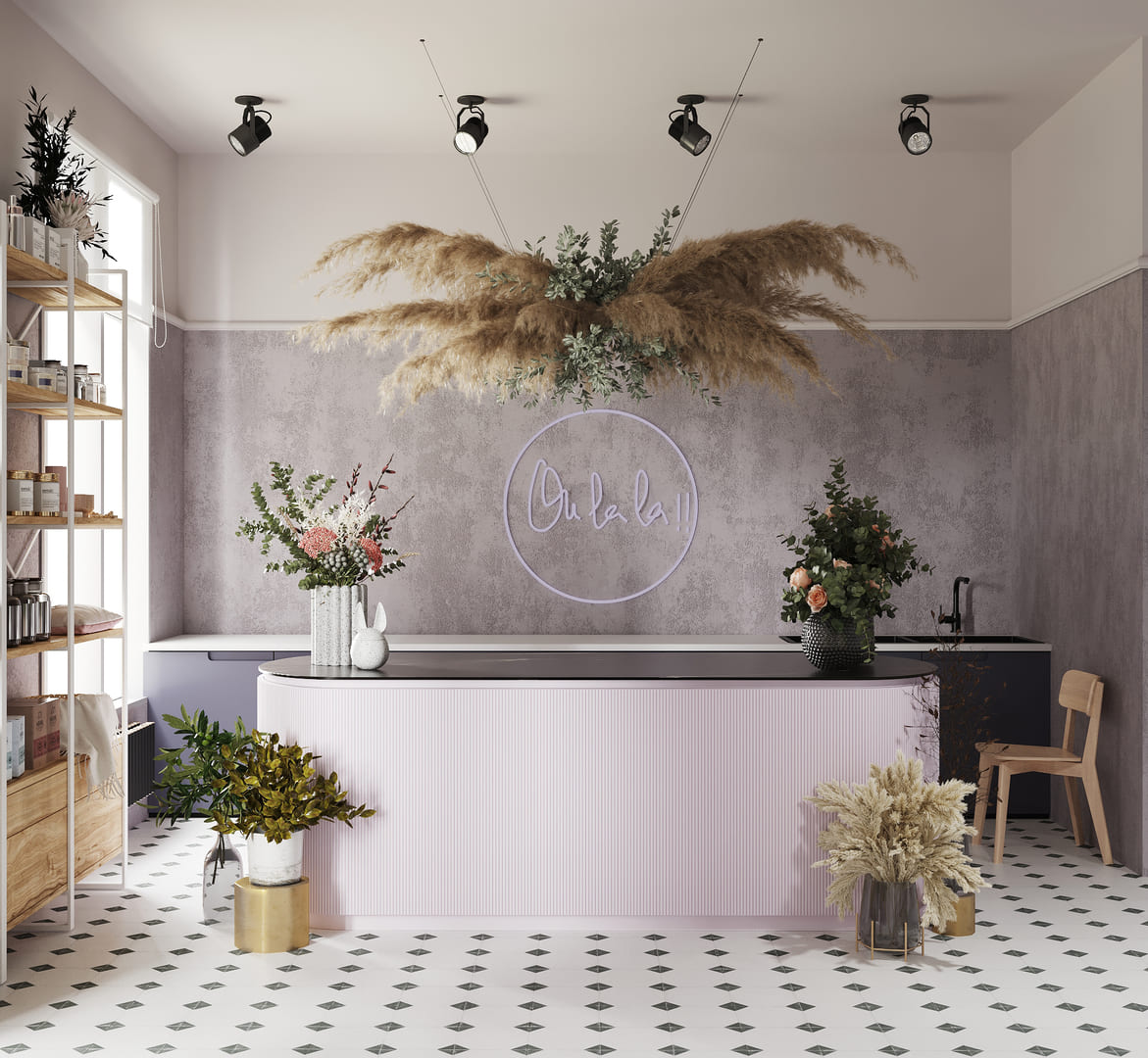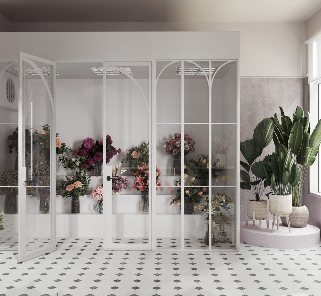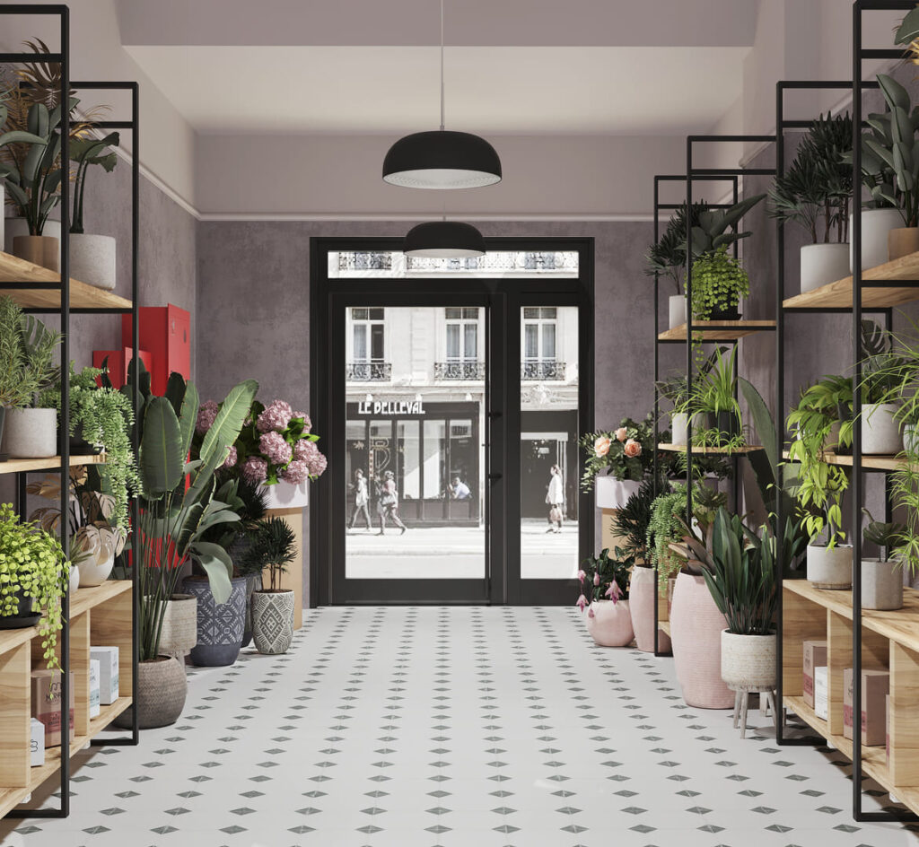 The design concept for the flower boutique centered around maximizing the use of space to effectively display cut flowers and bouquets while accommodating a cozy lounge area for floristry consultations. To optimize profitability, tropical and indoor plants were strategically placed throughout the boutique for sale. Additionally, a fragrance and perfume rack were incorporated into the layout to offer customers an enhanced sensory experience during their visit.